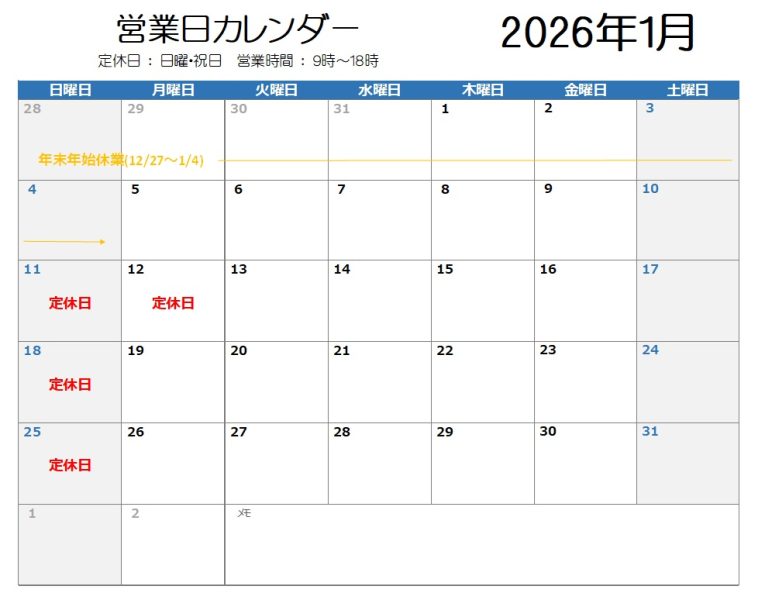 1月の営業日カレンダー